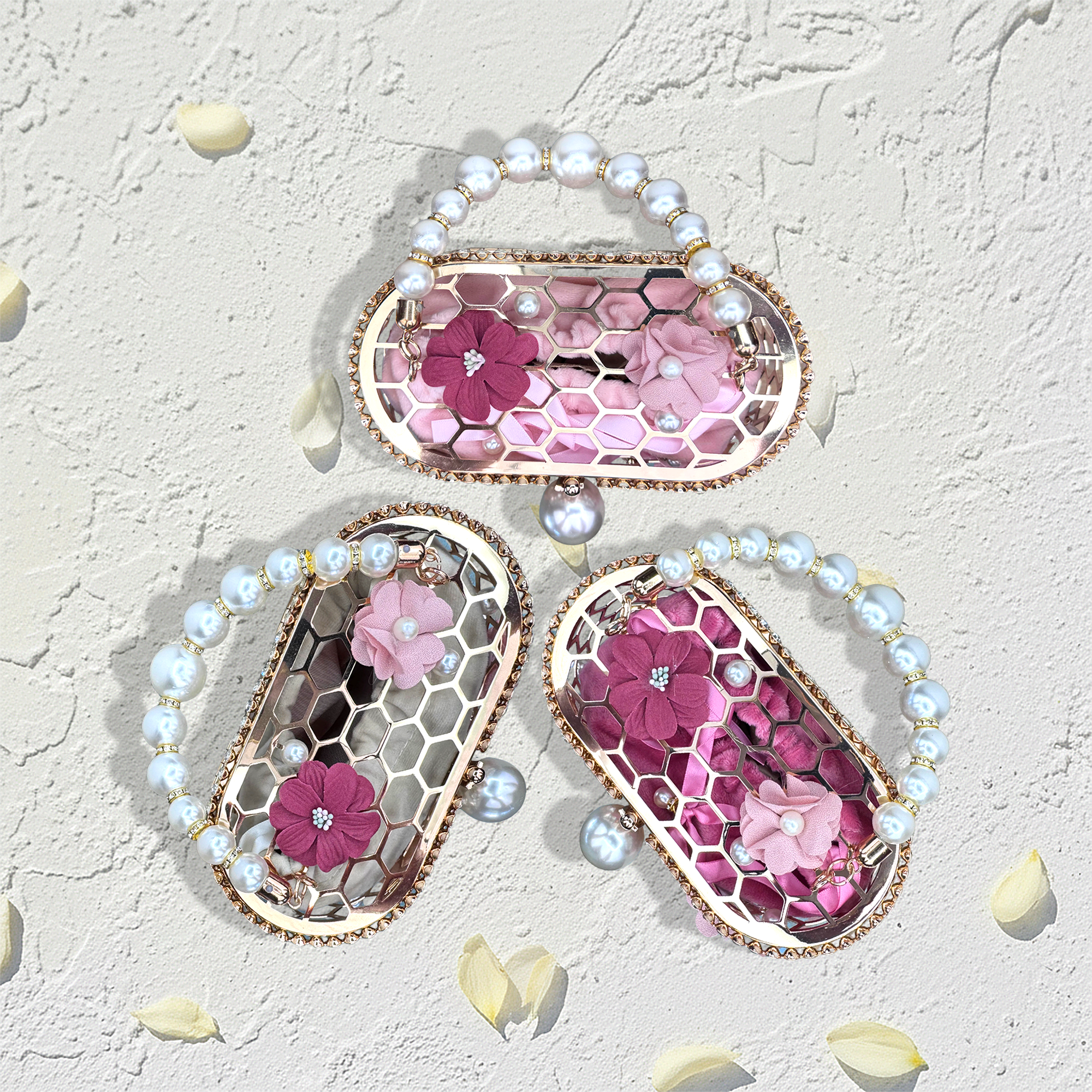 Make every entrance unforgettable with the Pearl Bloom Honeycomb Evening Purse — a jewelry-inspired handbag designed to sparkle from every angle. Romantic, feminine, and luxuriously detailed, this purse blends pearls, rhinestones, and floral accents into a timeless keepsake accessory.